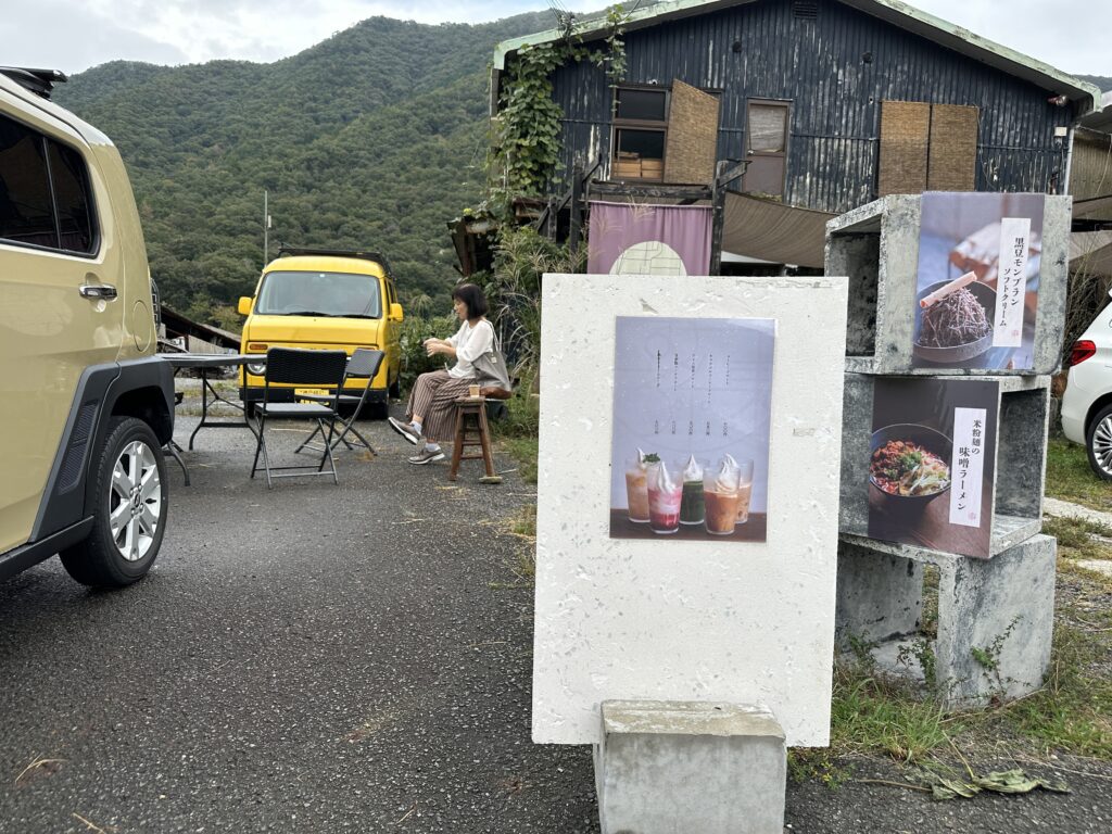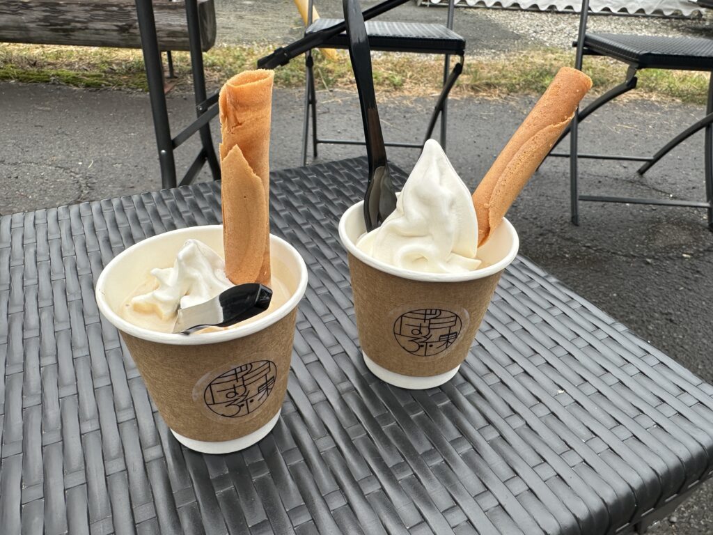 外の椅子は空いていましたが、雨で濡れており、店内の席は9組の順番待ちでしたので、テイクアウトで注文し、外の木のベンチ(乾いていた)でマッタリいただきました。