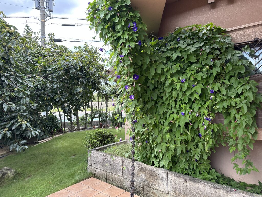 朝顔 が元気してがおり、 隣の柿がもっと元気し過ぎて、 実が多く(多分、1500~2000個は成っている)、 地面から1m位まで垂れ下がってきました。