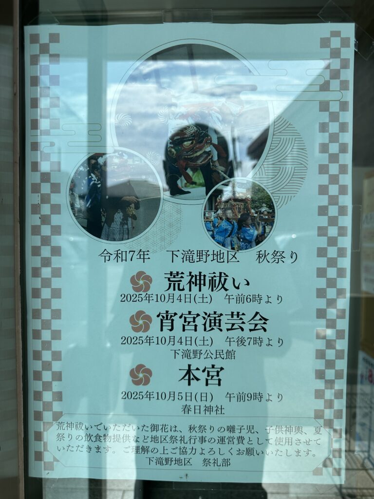 これは地区の五穀豊穣と、地区内の安全祈願、伸び行く下滝野地区の更なる発展を願っての行事である(多分、そういう系統の意味でしょう。。。)。