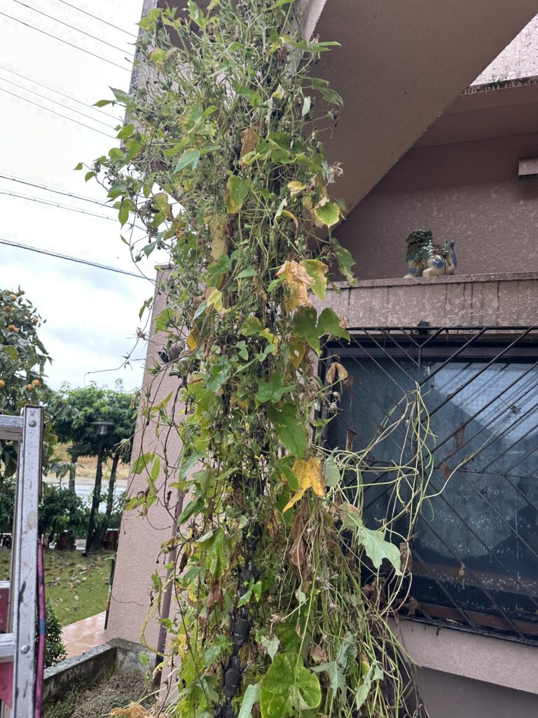 あさがおの蔓と言えども、これだけ絡まっていると、得意の荒業も通じません。。ハサミで一本づつカットして分離。
