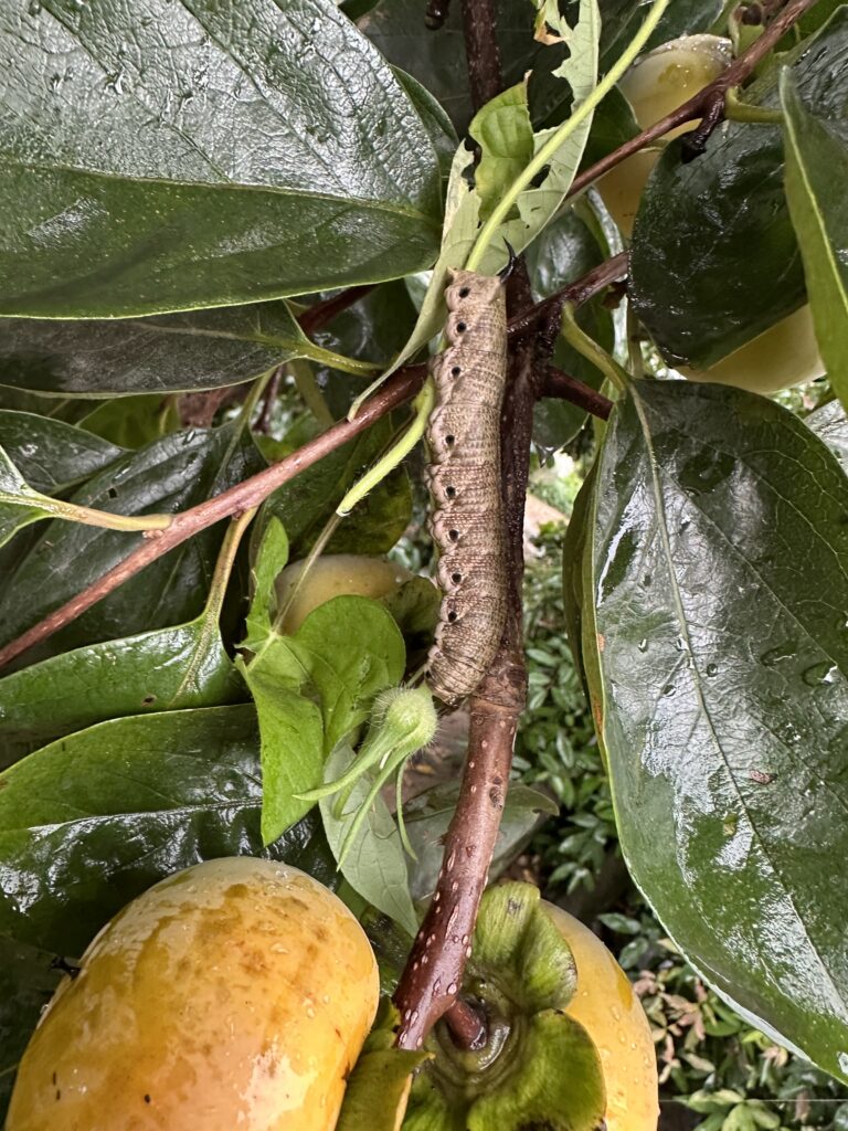 蔓と共に大きな幼虫が出て来たので、流石に蔓と共に もえるゴミ袋 に入れるのはかわいそうに思い、しがみ付いついた朝顔の蔓と共に柿の枝に付けておきました(←優しい人)。。