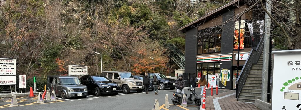 偶々なのですが、到着時にセブンイレブン有馬温泉店前の一等地のこのパーキングで1台分空いたので空かさず駐車出来ました。(帰る前に駐車場に戻った際の写真)