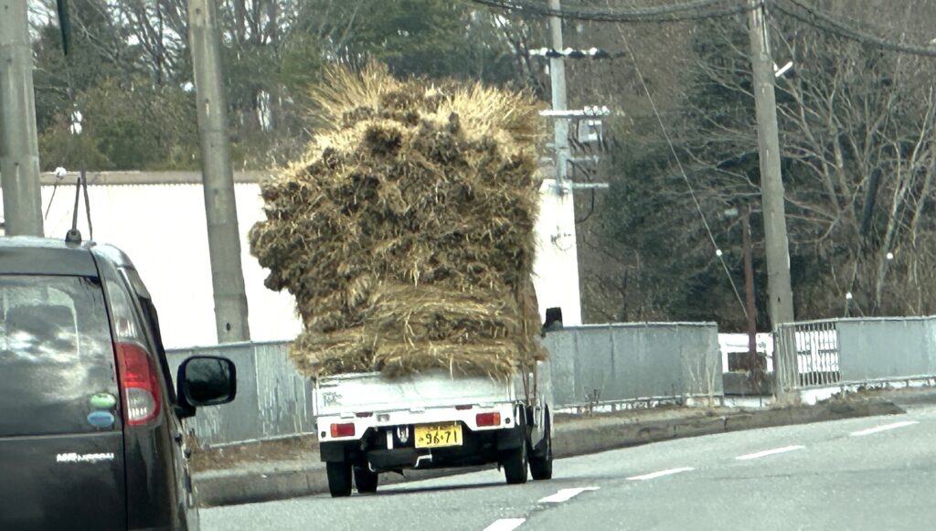 2台前を大量の藁を積んだ軽トラックが走行しているのを見て一瞬、ここ 東南アジア?かと思った。